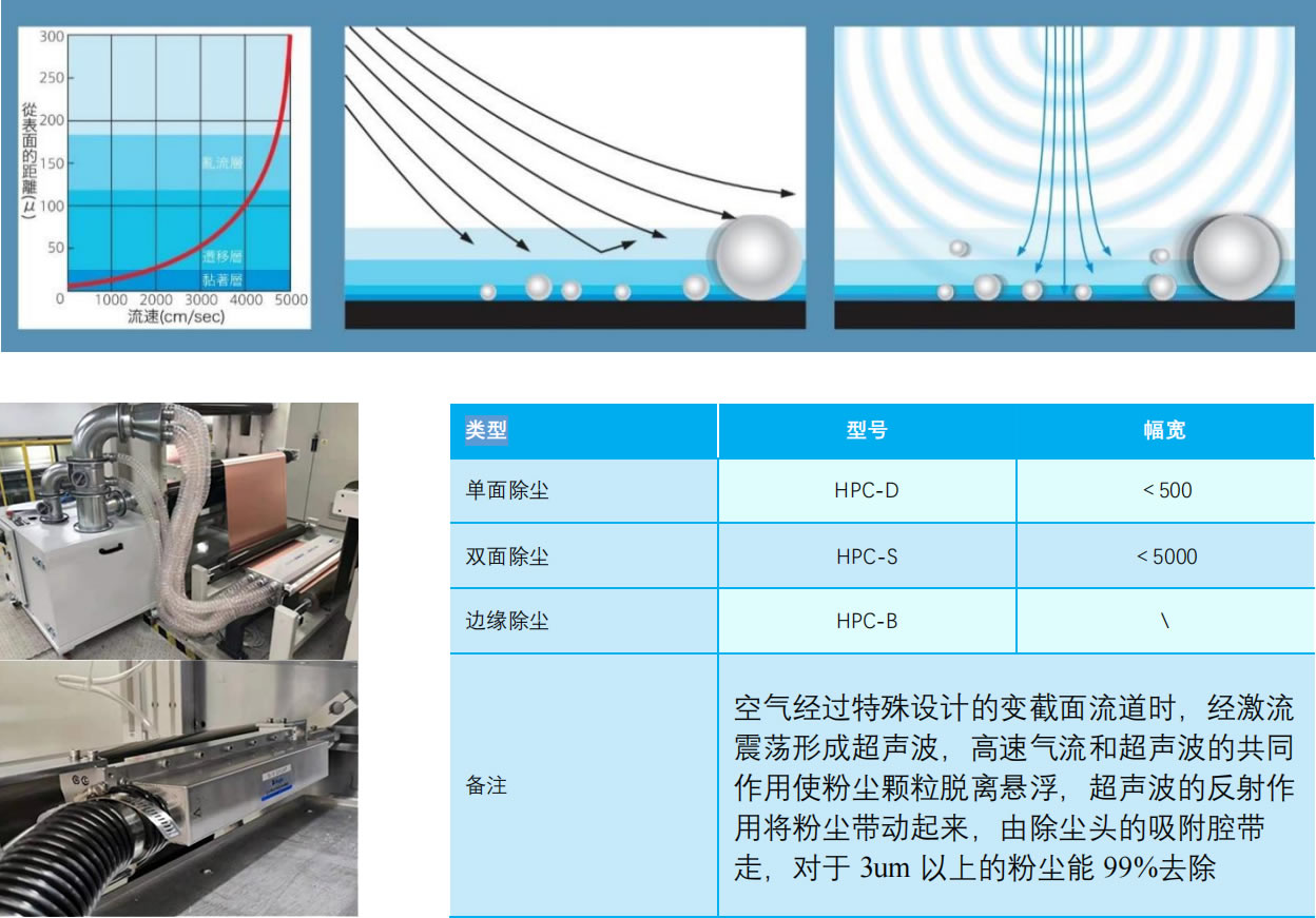 1、50微米以上尺寸的灰塵除塵率:99-100%。 2、不傷害產品的情況下將PARTICLE去除。 3、可以24h連續運作。 空氣在平坦物品的表面流動,因空氣越接近表 層產生的粘性抵抗下,流速會變慢。下圖是用 表表示空氣的流速與離表面距離的關系。粘滯 層的下面的粒子,只是單純使流速更快,一般 來說是難以去除的。